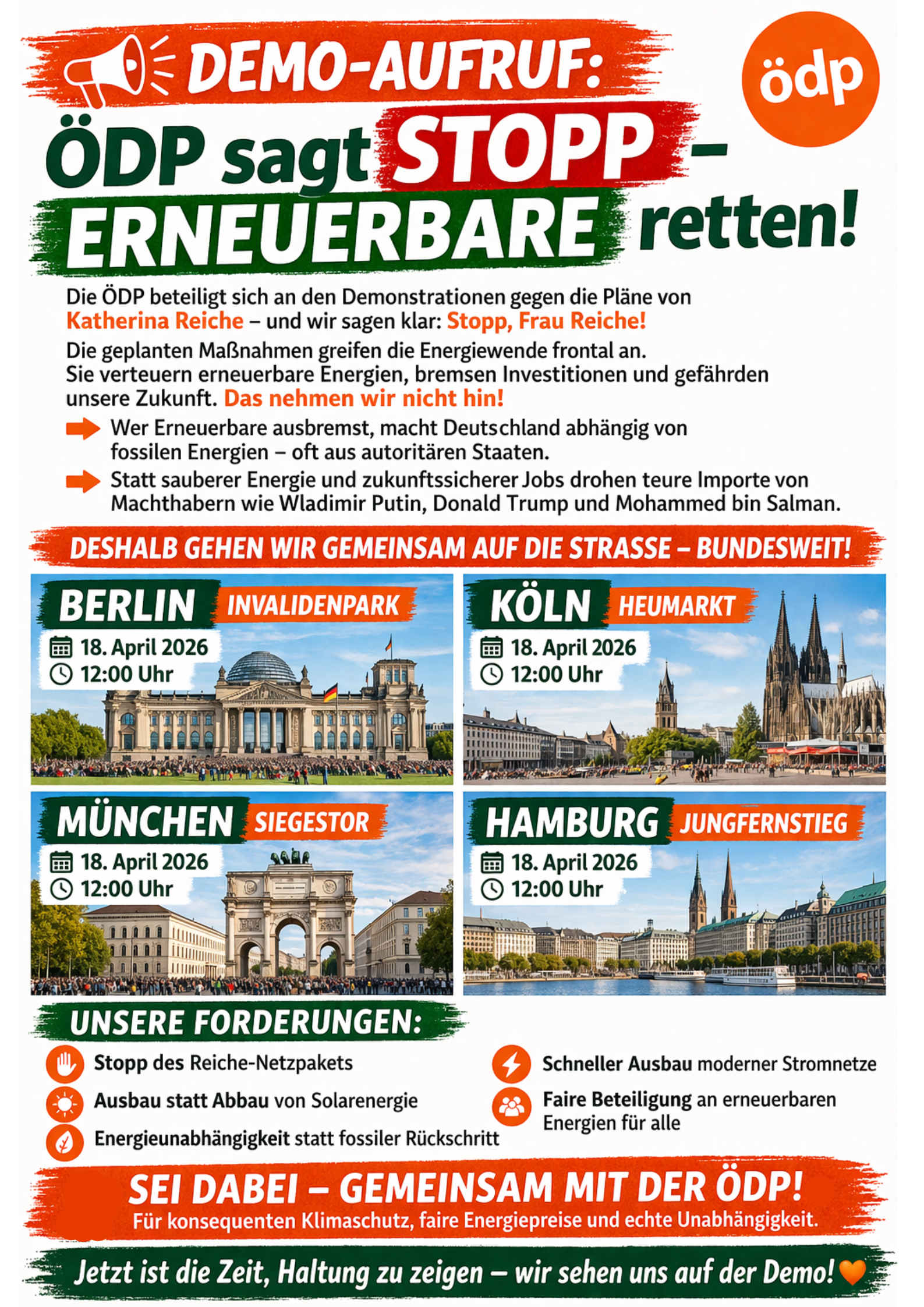 Wirtschaftsministerin Katherina Reiche (CDU) greift die Energiewende an – doch quer durch die Gesellschaft formiert sich Widerstand. Den bringen wir am 18. April mit Demos für die erneuerbaren Energien auf die Straße: in Berlin, Hamburg, Köln und München. Seite an Seite demonstrieren Menschen aus allen Teilen der Gesellschaft: Mieter*innen und Unternehmen, Klimaschützer*innen und das Handwerk. Für saubere Energie, für Unabhängigkeit, gegen fossile Lobbypolitik. Sei dabei!