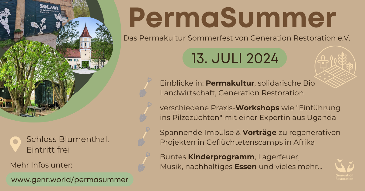 Am 13. Juli 2024 feiert GenR den PermaSummer auf Schloss Blumenthal, Bayern. Ein buntes Sommerfest der Nachhaltigkeit und Regeneration.