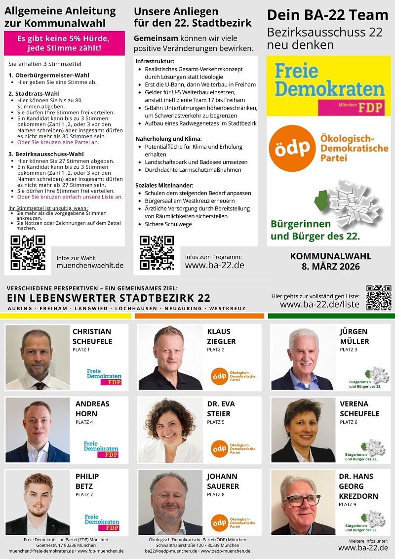 Zur Bezirksausschusswahl am 8. März 2026 tritt eine Liste aus FDP, ÖDP und Bürger:innen des 22. Stadtbezirks mit insgesamt 27 Kandidatinnen und Kandidaten an. Dazu zählen sowohl engagierte Neuzugänge als auch erfahrene Mitglieder des Bezirksausschusses.