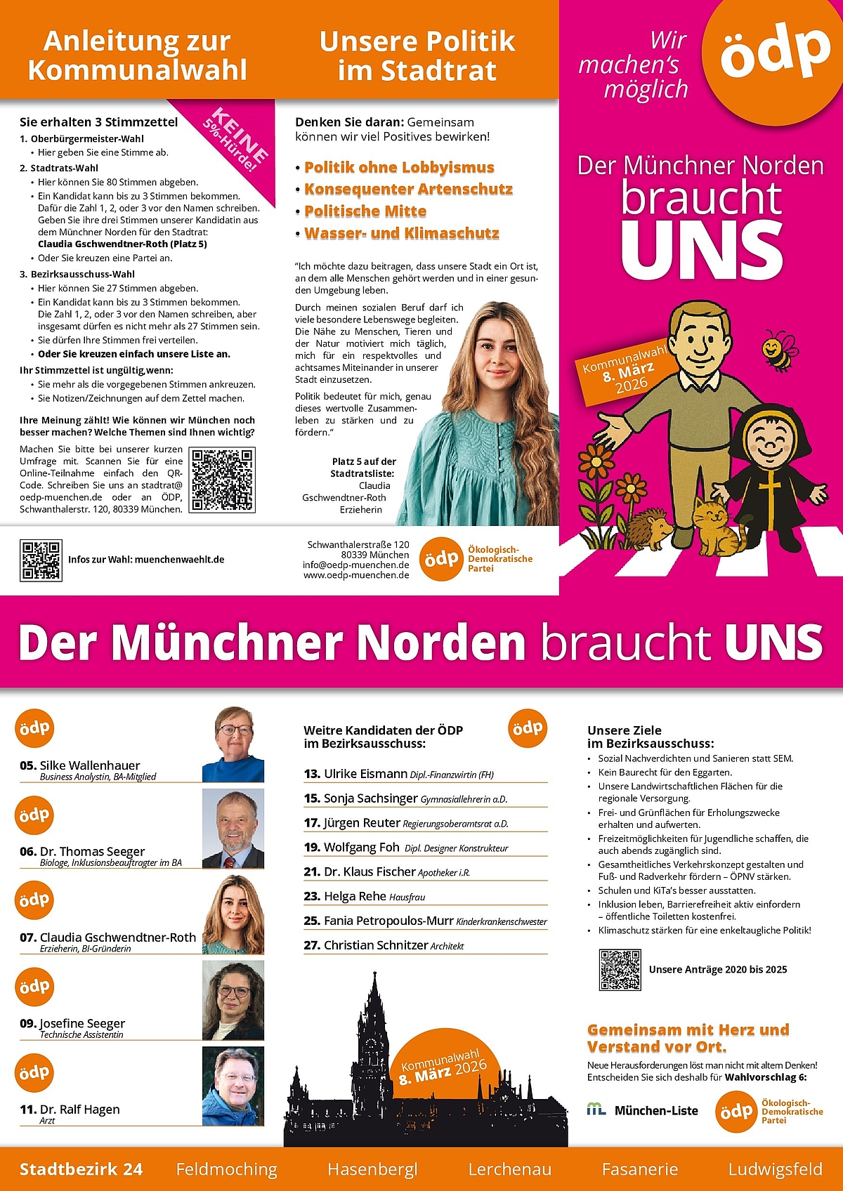 Zur Bezirksausschusswahl am 8. März 2026 tritt eine Liste aus München-Liste, ÖDP und parteilosen Bürger:innen des 24. Stadtbezirks mit insgesamt 27 Kandidatinnen und Kandidaten an. Dazu zählen sowohl engagierte Neuzugänge als auch erfahrene Mitglieder des Bezirksausschusses.